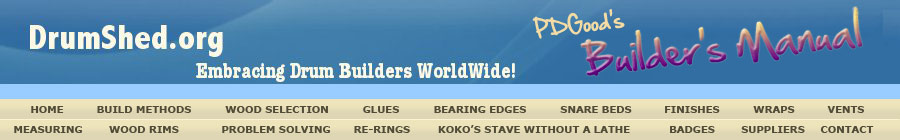 In retrospect, I realize I should have done a couple things differently: 1: When first gluing the veneer to the shell, leave about 1 inch of the veneer unglued along the edges. That way, I could trim the joint perfectly with a straight edge and knife, then brush some glue underneath the edges and glue them down for a clean perfect joint line. 2: The splits started when I was wrapping the veneer around the edge with the nylon strips. I could have prevented the splits by taping with veneer tape across the grain along the entire edge to reinforce it. And learned the hard way: Heat on veneer like this makes it shrink and split. Veneer Softener PDGood: Does anyone know a formula for making veneer softener? randyb: Tbone got me to make a mixture of1/3 water, 1/3 carpenters glue, 1/3 glycol. Veneer Over Veneer lameduck: Does anyone have experience applying a veneer over an old veneer and if so how did it turn out? I've read that it's not an advisable method but is it really that harmful? ZrowBD: Plyshells are made of veneers glued to each other aren't they? koko: Normaly a shell is underzised, as far as I could find out it varies from 1/15 to 3/16 undersize. Before you go, calculate the end result and make sure the head will still slide over the shell. drumwerx: If they are just maple plys and are still undersize then it will be no problem. I do this all the time with all of my drums. The prep work is easy just sand them with rough sand paper so it can have glue bond to it. Then glue the new veneer on the shell. If they have never had anything on them and they are just stained or painted then the shell will still have enough room to add veneer to them. tbone: Brittle veneer is risky, so I back most of my veneers with a 2nd ply. You can use another veneer in a 90° position to the original. Because I don't like 2 thicknesses of veneer, I back mine with a fleece I buy by the roll from veneersystems.com. It's not on their website, so you have to call them. I'm not sure how the 2ply or veneer/fleece methods would work with the iron on process cause I only use the vacuum bag system. I do recommend the veneer flattener sauce, though. Liming PDGood: (to Coco) What do you mean by limed? What's involved in the process? |