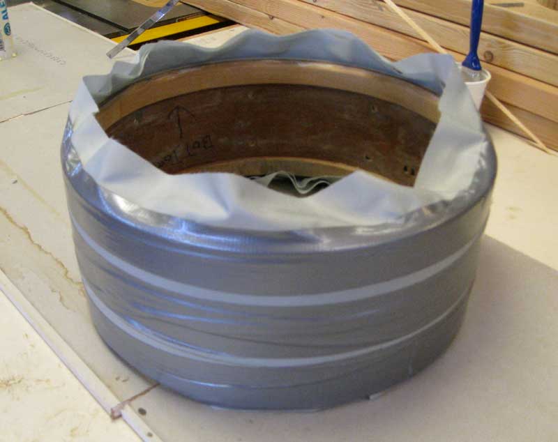 The gluing operation was a bit demanding and I had no time once glue was applied to take any pics until the veneer was fully wrapped onto the shell and secured. I used the nylon fabric strips again, but found it was significantly harder than the smaller snare drum to get it all done quickly. I added some duct tape and packing tape around the edges to hopefully get a good bond. I think that maybe rubber inner tube material would work better than the fabric strips I am using.