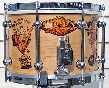 jontheodore: I have an awesome mural created by an amazing artist friend of mine that I want to put on the drum when its completed. ...What is the best way and/or the best material/plastic/product to use to print the image onto so I can wrap it around the drum? jbfrench75: Someone around here (don't remember who) did a snare with tattoo graphics printed on a transparent adhesive paper with laser printer and put on some lacquer (or varnish)...it worked well in fact. OPFOR: That was me! You can get the waterslide paper online and then print whatever you like on it. Make sure you use a printer capable of the highest quality output or take it to Kinkos and let them run it for you. It is easy to use and looks terrific under lacquer. PDGood: Link to Waterslide paper. http://www.misterart.com/g8575/Lazertran-Waterslide-Decal-Paper.htm?WT.mc_n=froogle&WT.mc_t=CPC&WT.mc_id=8575 Finishing the Inside of the Shell morbido: I was wondering if there is anyone out there that puts any coat on the inside of the shell? To protect the wood from father time better. Any thoughts on this? altereddesigns: I sometimes use some blonde wood wax, seems to give a slightly warmer tone. Also nice and easy. Sam Bredeson: Usually, I put at least one (more often three) coat of varnish. I've also used Vaseline. rhjanes: Usually a wood oil. A coat of lacquer is fine also. JLee: Three coats of tung oil. Shuffle: Any idea what kind of interior finish on birch shells would bring out some mid-range freqs? JLee: Not sure you can really break it down like that. I know that if you OVER seal the inside, and go for too much gloss, it accentuates the highs. I think you would probably be best off sticking with a minimum of product for the inside, like maybe a couple of coats of satin inside tung oil. bobober: ...for an inside oil coating I was thinking (about using) tung oil. I just wanted to double check my method: 1st coating Light sand Then 2nd coating Is that it? rhjanes: On the inside, you don't even need to sand between coats. Just wipe it on with an old cloth and let it sit about 5 minutes. Then wipe it dry. Wait a day and do it again. If you want, you can also sand it while it is wet. I do that. Apply it, take some wet/dry sand paper, inside, about 280 or 320 grit is fine enough. Then, just sand in the oil. Wipe your hands off and then wipe the inside and you're done. bobober: Ok, alright thanks but one more question - when you sand the oil is that to sand the oil into the wood? rhjanes: Yes, you apply the oil and a few drops on the black, wet-dry paper. Then, sand with the grain (It's messy). The oil will sand into the wood. The paper will start to drag. I do that for maybe 15 minutes. adding oil when it gets too dry and draggie. Then stop and start wiping off the excess (which isn't much!). Let it dry over night and do it again the next day (or night). Let it sit and dry again. Then, do what ever is next in your assembly (exterior). mfp1016: An oil finish of only 2 coats, despite wet sanding, will essentially do nothing except temporarily color the wood. It's about as good as natural wood. Tung oil needs at least 8 to 10 coats before it has any sort of protective properties. Also, make sure you're using 100% tung oil, not a tung oil finish (ie Formby's). ebuzzcut: I remember seeing some drums that were finished on the inside and the outside. I was wondering what kinds of finishes these were done with, and how it affects the sound. rhjanes: (On the inside) I use three coats of a wood oil. Maloof, even just boiled linseed oil. I also only rough sand. Sand the inside at 100 grit (dry sanding the wood). Apply the oil, wipe off the excess, let dry over night. Repeat at least once more. Tone changes? No idea. You should always protect the wood. ebuzzcut: I was talking more about using a lacquer or satin stain on the whole shell. Sam Bredeson: Lacquering the inside would make the drum sound brighter, with less of the woody character. I think it tends to make the drum sound towards an acrylic. I used to put fewer coats of whatever I was putting outside on the inside of my drums, but lately I've been using Vaseline (which works great, but has to be re-applied every few months). gabbagabbahey: In a picture of Phil Collins' drum kit the shell inside is painted. What's that exactly? Does it change the sound ? rhjanes: .... silver paint. Gretsch used to do that....thinned down boiler paint. Some will say thinned down zinc fence paint. Gretsch was based in NYC, so to me, boiler paint makes the most sense (stuff was close at hand from all the steam boilers heating buildings). Most any drum, has a finish to protect the wood, even the inside. I do mine with a wood oil, boiled linseed, something like that. does it change the "sound"....well, yeah. But so what. unprotected wood won't last. JLee: The more thickly the shell is painted, the more likely it would be the sound of the drum head and not the shell that dominates the sound. Even with a barely finished inside shell, a lot of what you hear, is initially the head. I do think that an overly finished, shiny smooth shell will not "hold" the sound the same way. Probably emphasizes more attack. Kanbasher: Gretsch has been using the silver paint sealer for quite some time. It's one of the recognisable features that are unique to Gretsch. My thinking is that putting a glossy finish inside the drum may make it more reflecive to the sounds coming from inside the shell. Not a proven theory though. Veneer There are several ways to apply veneer, but in all cases, pressure is needed. Professional cabinet makers and other wood workers typically use a vacuum press. But a drum shell is round and sometimes thin so it poses some problems for this method. Many independent drum builders use a heat cure glue - you apply the glue to both surfaces, let it dry, and then iron on the veneer using a standard household iron. A wood softener can be very helpful. They advertise that after using it you can wrap a piec