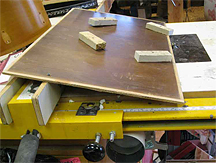 Reducing The Amount Of Overtone Ring In A Drum Recutting Uneven Edges Shell Diameter Too Small Lug Problem Broken Screw Head Indentations in Keller Shells Reducing The Amount Of Overtone Ring In A Drum PDGood: There are many ways to accomplish this, some more aggressive than others. Listed below are various methods beginning with the most gentle and making the way down the page to the most aggressive. Tuning. This is the first step you should try. It's not easy, but it is the best way to reduce ring because it doesn't otherwise alter the sound of the drum and there is no cost involved. The idea is to get the tension the same on each lug by tapping the head about an inch or two away from the lug. Try to match the sound exactly near every lug. The closer you get, the more ring will be reduced. Thick heads make this more difficult. There are limits as to how much ring you can reduce this way. On some drums a good tuning is all you need. On others it helps but just isn't enough and you will need to combine this with other methods listed here. Also, know that if you tune the top (batter) head very tight, it will reduce ring. As a way to test how tight it is - you want to get it to the point where it is difficult to push the head in with your thumb. Adding air vents. This makes a subtle difference. A big plus is that it doesn't alter the tone of the drum as so many other methods do. All the gel and tape methods drastically remove highs from the sound - this way doesn't. Another plus is that you can add them one at a time to gently alter your sound. You're very unlikely to go too far. I've used up to (4) 1/2" vents in a snare drum. If you put huge vents in like Spaun and some other companies are doing these days, you get into a whole different sound. On the down side, it does require drilling holes which you may not want to do on vintage or expensive snares. Adding wood rims. I've been told that this dries out the sound because the metal rims contribute to the ring, whereas the wood rims do not. I don't have any personal experience to verify how much it changes things. Putting gels or tape on the heads. It's quick, effective, easy and cheap. The down side is that it really reduces the high end (treble) from the sound of the drum. Changing drum heads. If you go to a thicker head or from a one ply to a 2 ply, it will reduce the amount of ring. It will also drastically alter the tone of the drum, so you have to experiment with brands and different models within the brands to find the right combination for your drum. Experimentation can be expensive. Get with friends and try different head combinations on each others drums. The Evans Genera Dry and similar heads is about the most drastic thing you can do. They have perforations around the rim of the head and it makes a huge difference. It also drastically changes the sound - not for the better in my opinion. The only thing more drastic than this would be setting your wallet on the drum head - an old studio trick that takes 100% of the ring out. Recutting Uneven Edges mountainhick: Just wanted to share a quick dirty jig I came up with today to deal with a vintage shell with edge problems and re-cutting challenges. This is also follow up to a previous thread where I mentioned how I cut angles other than 45 degrees with a 45 degree bit and a simple angled table. Anyway, I am re-furbing a Slingerland kit and when I put one tom on the plate glass to check the edges found: Problem 1: A dip several inches along the edge... I kid you not... 1/8" out of level from the factory! This edge was original and had never been touched. Obviously needed re-cutting. Problem 2: The angle of the stock slingerland edges is not 45 degrees, and all I have is a 45 degree bit. I don't know exactly what angle they are, but it doesn't really matter, because the cure was to align the jig to the stock inside edge cut itself.. no need to measure the angle. Problem 3: The inside of the re-ring is very irregular and the resulting thickness of inner edge to outer surface of the drum varied by 3/16". So, just using a piloted but as guide would create an irregular diameter. |