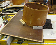 Problem 1: Level the good edge opposite the unlevel edge on a flat sanding surface (on the plate glass), then cut the opposite unlevel edge on the tablesaw down to the lowest point of the dip. Problem 2: Create a tilted table jacked up to match the needed angle of cut using the 45 degree bit. I just screwed a piece of plywood to the router table/saw fence at the correct angle: Problem 3: Screw 4 guides onto the jig around the outside of the shell so when rotated, the shell moves in a circular pattern indexed on the outside of the shell, not the irregular inner surface of the re-ring. Note: to adjust depth of cut, the whole jig can be moved by moving the fence, and the router bit can be raised and lowered. During cutting, the bearing pilot on the bit never contacted the work. Shell Diameter Too Small PDGood: I have a shell that is 13-3/4" instead of 13-7/8" as it should be for a 14" drum. The biggest problem turned out to be the snare wires. The manufacturers of snare wires rightfully assume that the shell is made to the industry standard 13-7/8". On my slightly smaller shell that put the ends of the snare wires nearly touching the bearing edges. In fact, if they are not centered perfectly they ride on the bearing edge and even if they are centered perfectly, if you attempt to tighten the wires a little bit, that uncenters them. The resulting sound of snare wires resting on the bearing edge is absolutely horrible. The solution was incedibly simple. I just bought wires for a 13" drum (12-7/8") and haven't had any problems since. Lug Problem LJ4174: OK, I have this friend... Yeah, a friend of mine who built this custom drum kit and last weekend he decided to finish the last shell that's been laying around cause he was thinking he might add a peice to his kit... The shell is a 12" tom shell and it's already finished, buffed and ready to go... However, when my "friend" drilled all the lugs he thought he put them at 1" from the top of the shell, so he also put these lugs at the same location, 1" from the top. He's using mini lugs, so 2 holes per lug. Well, after he started to put everything together and got to the DSS mount, he realized all 12 of his lugs are too close to the edge of the drum and the DSS won't fit, turns out the rest of the drums where down 1.5" - maybe even 2" from the top - see, my friend didn't take one of his drums apart, he just went off memory... OK, so that's the story, so how would you guys handle this... Would you re-drill the lugs and plug the holes that aren't needed. If my "friend" did this, 1 of the holes would be hidden with the lug and the other hole could be easily hidden because the tension rod would go right over it, however you'd see both holes on the inside of the shell... Or... I was thinking my "friend" could just not use the DSS and put the tom mount right on the drum, however the rest of his drums have DSS mounts... Most likely though this drum will be on the other side of the kit, like a left handed floor tom... He was thinking of maybe putting it over the bass drum, but that would probably look goofy without a DSS... Sam Bredeson: I would use the farthest hole already drilled to be the nearest hole on the new pattern, then just try to fill/cover the one hole left over. (if that makes any sense..) turn | o o into | x o o | =edge, o =hole, x =filled hole Bdrummer: Yes, I'd fill it. if you do it right, it's barely noticable from the inside. Sand it off, use very light /natural filler. What I did once was: use some 'sawdust' (don't know the English word) to mix it in that hole with the filler as a 'final layer' so when you sand that it's pretty much the exact same color as the shell. At the outside, just finish it as well (if that's possible with the particular finish). In that way it's pretty hard to notice... LoodVig: IMO, you should slap the mount right on the shell. Plugging and re-drilling could turn out pretty ugly, if not perfect. No one will notice that one tom doesn't have a DSS unless you point it out. Crazy8s: A 12" shell costs all of what, $40? Buy a new shell. wittpercussion: You can also get a plug cutter or some maple plugs at your local woodworking store, glue sand and it looks a lot better than filler. Broken Screw Head amram: A head of a screw holding the company badge to a tom broke off recently. While this is really not a big deal because the other three screws are still intact, it would be nice for the sake of completeness. It looks like there would be no way for me to take the remainder of the screw out without damaging the shell. Anything I can do? Is there anyone I could take the drum who could perhaps.. I don't know .. weld a screw head back on? skaman: Use a screw extractor to take out the broken screw and do your best to find a matching one. amram: Won't a screw extractor create a larger hole around the broken screw? Could this be bad for the drums? And would an identical screw be able to fit into the slightly larger hole? skaman: If you use the right size extractor it wont make a larger hole. PDGood: If you wind up making a bigger hole you can fill it with wood filler or a combination of sawdust and wood glue. Then redrill. ange d mange: And when you put the badge back on, it'll cover the hole anyway. Indentations in Keller Shells dawgman: I ordered a couple 6.5" x 14" Keller 10 ply maple snare shells recently. This is my first build, so I don't really know what to expect in terms of the overall quality of the shell. On both shells (though more severe on the second shell), there are what appears to be "score lines" on the inner most ply. Not to be confused with the line where the ply wraps around and meets up with itself. This line is an indent running the whole width (6.5") of the shell.